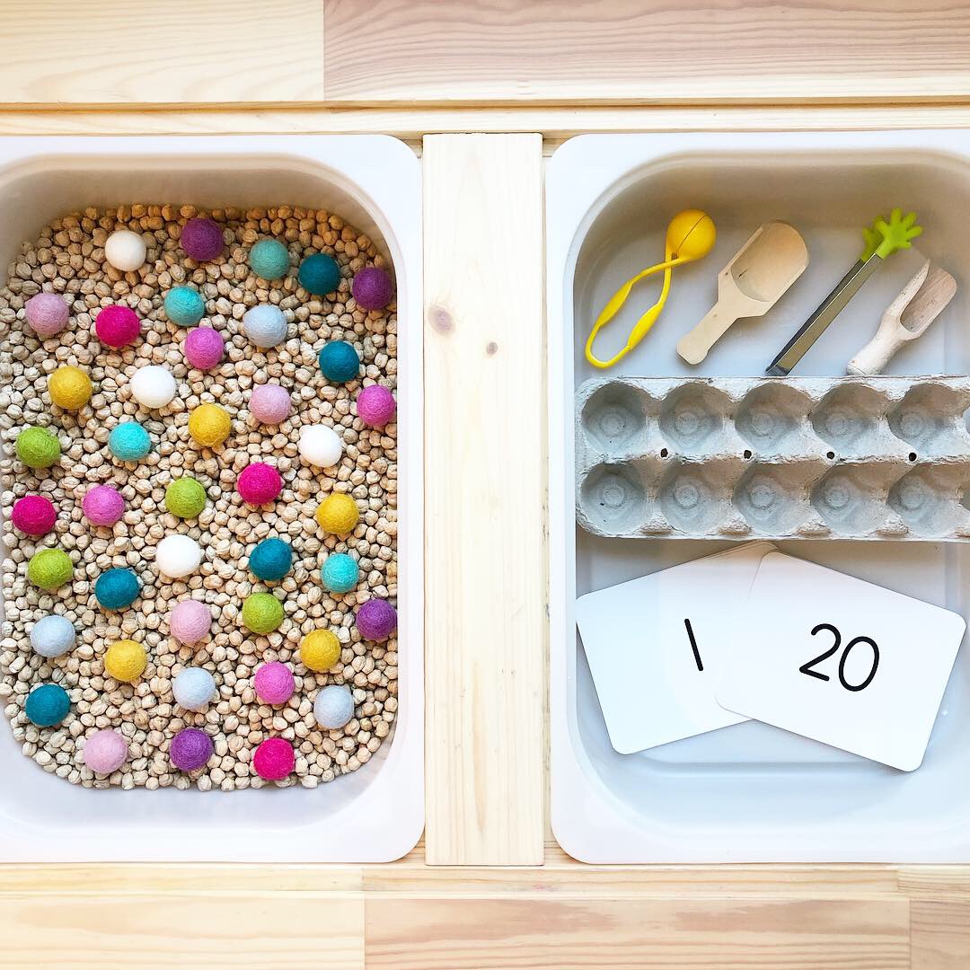 You can basically use anything you’re comfortable letting your kids play with as a sensory base! My favorites are rainbow rice, chick peas, and kinetic sand!