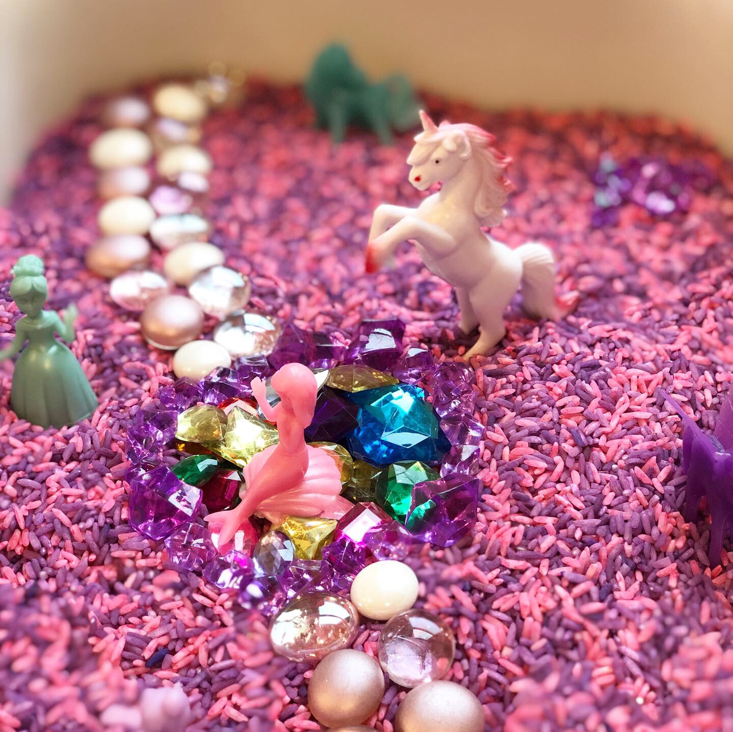 So now… on to how to make the PERFECT sensory bin… There is NO ONE WAY! Whatever is perfect for your child and your family (and your sanity) is what will be perfect! If it was my husband getting the bin ready for the kids, I KNOW for a fact it wouldn’t be rice… he just can’t handle stepping on it everywhere. I’m a bit more chill about it and don’t mind vacuuming it up after the kids are done, or 4 times a day, or every 5 minutes… so, I don’t chill well, but I don’t mind the clean-up is what I’m saying. So, you need to do what’s right for you! If you’re doing a sensory bin inside and you shy away from a mess, you may pick a sensory base like kinetic sand or play doh! It’s whatever works for YOU! If your kiddo is suddenly into dragons or fairies, you may pick some of those favorite toys and add them to your sensory base for some fun pretend play! I did a really fun fairies and unicorns one a few days ago: